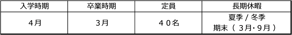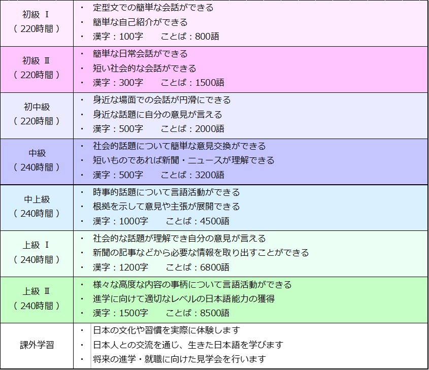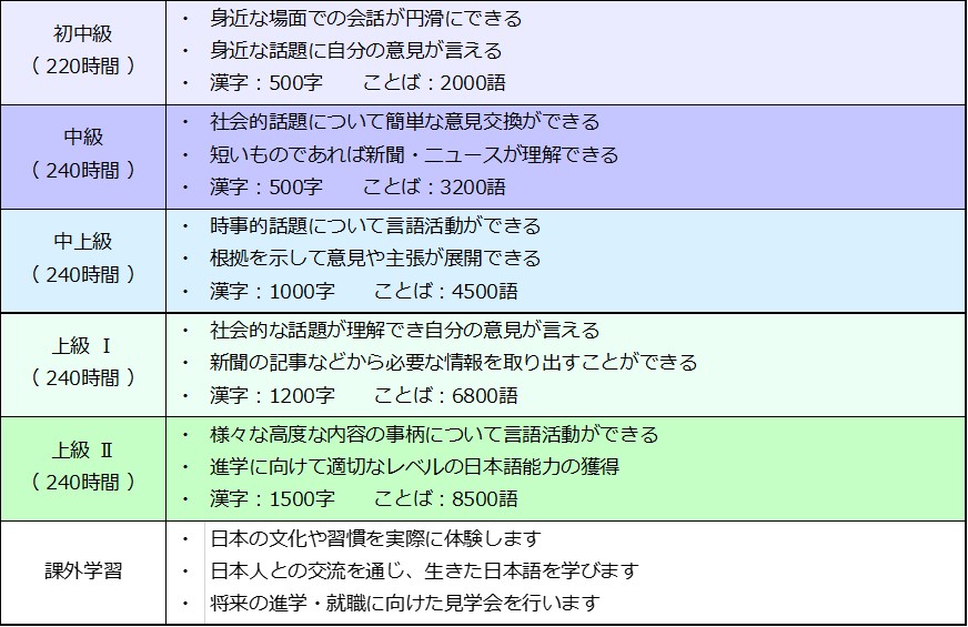 将来、国際社会で活躍できる高度人材を育成するため、日本の大学院、大学、専門学校への進学を目的とした教育を行うとともに、高等教育機関において必要な言語的知識や技能だけでなく、広く社会に関心をもち、多角的な視点で物事を考え発信できる力を身につける。